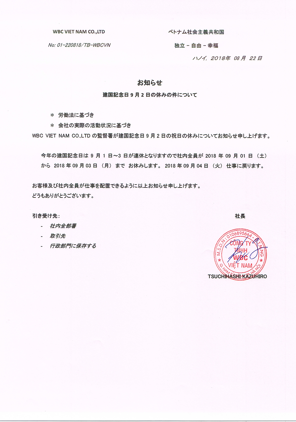 WBC VIET NAM CO.,LTDの監督署が建国記念日9月2日の祝日の休みについてお知らせ申し上げます。