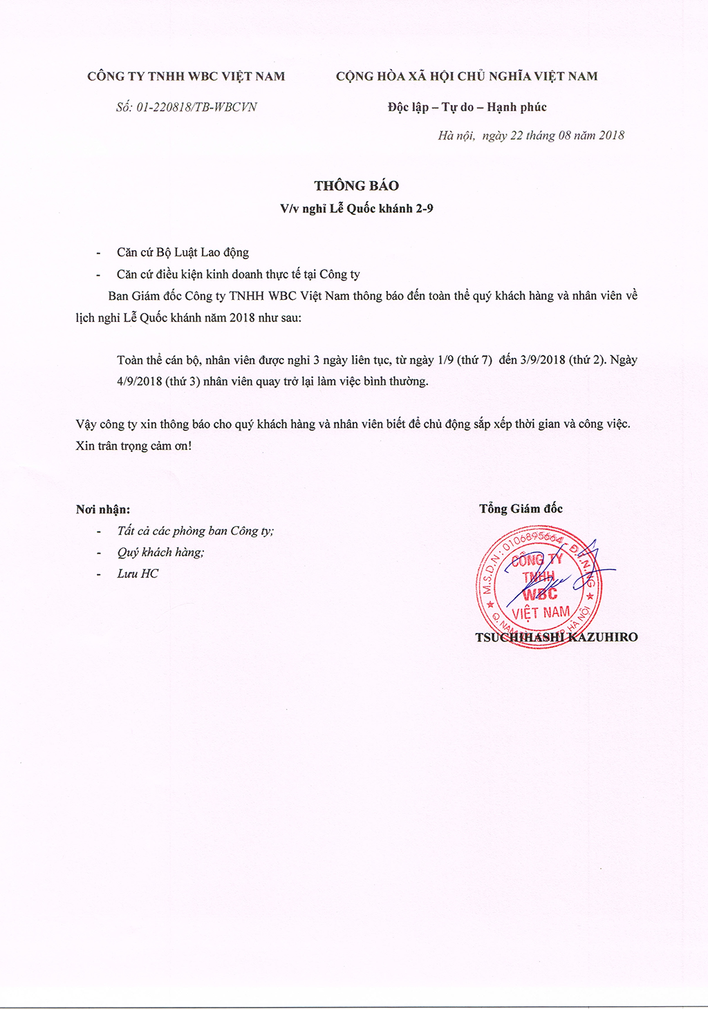 Ban Giám đốc Công ty TNHH WBC Việt Nam thông báo đến toàn thể quý khách hàng và nhân viên về lịch nghỉ Lễ Quốc khánh năm 2018 như sau: