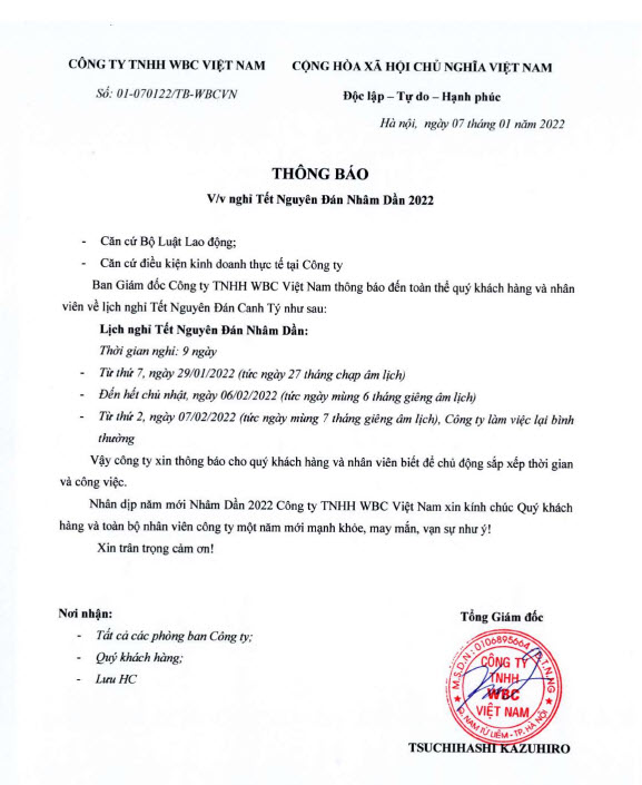 Ban Giám đốc Công ty TNHH WBC Việt Nam thông báo đến toàn thể quý khách hàng và nhân viên về lịch nghỉ Tết Nguyên Đán Canh Tý như sau: